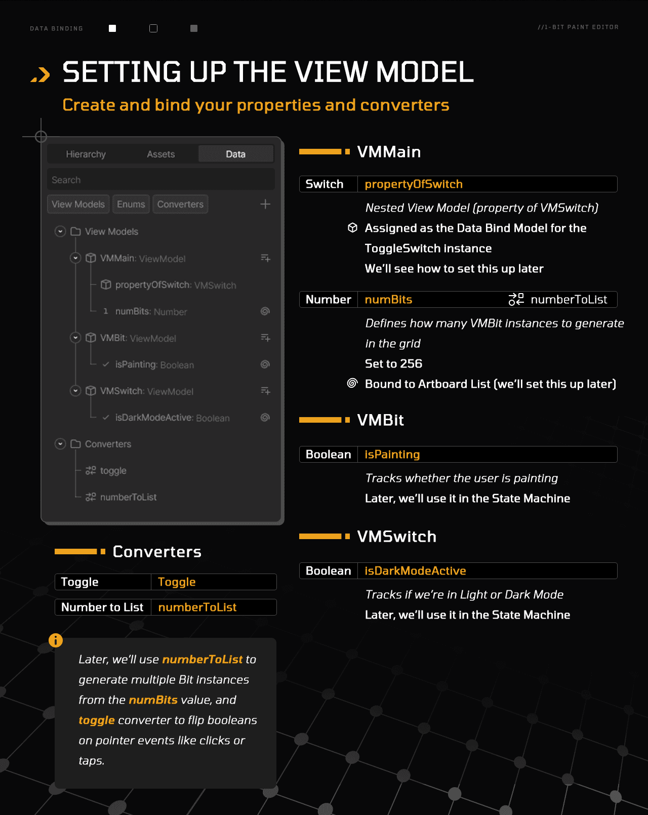 Next, create the data structure for the project. You'll need three View Models and two Converters set up as follows: