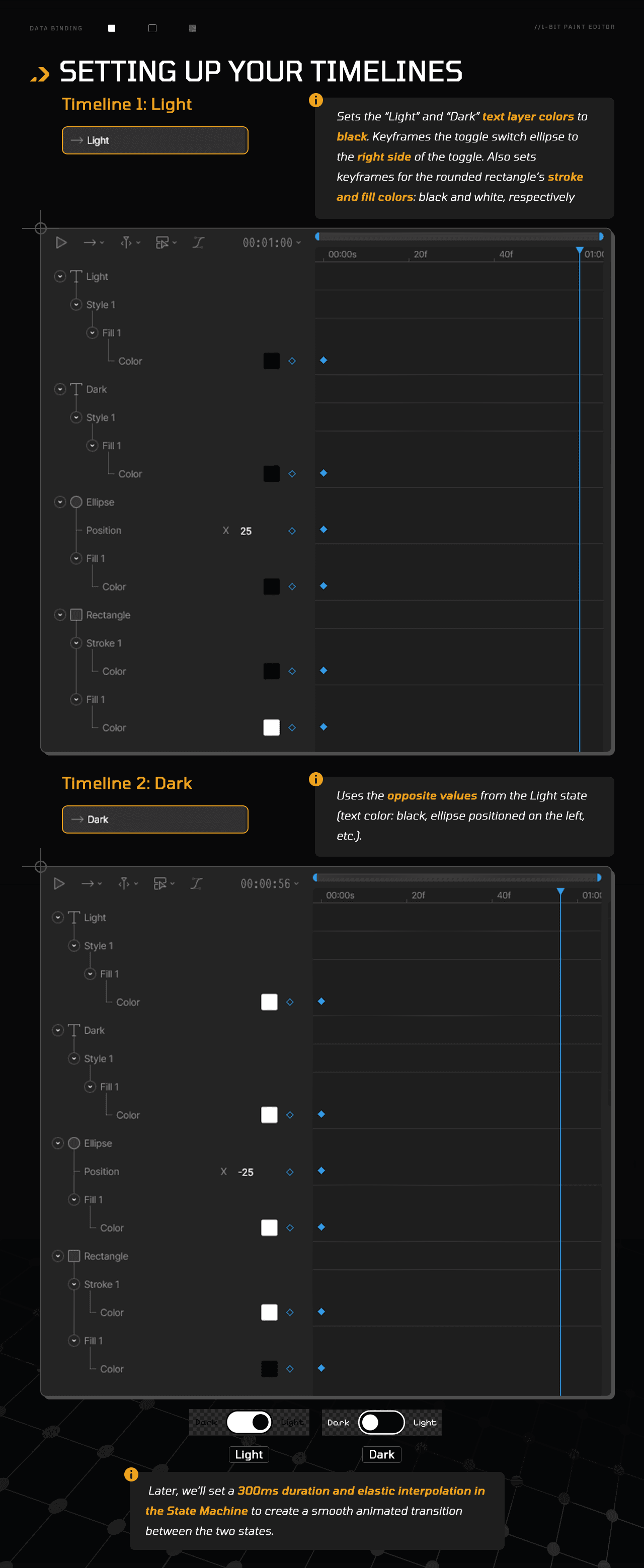 With the visual structure ready, it's time to define behavior. We'll use State Machines to set up interaction logic across three artboards, each with its own timelines, listeners, and goals.