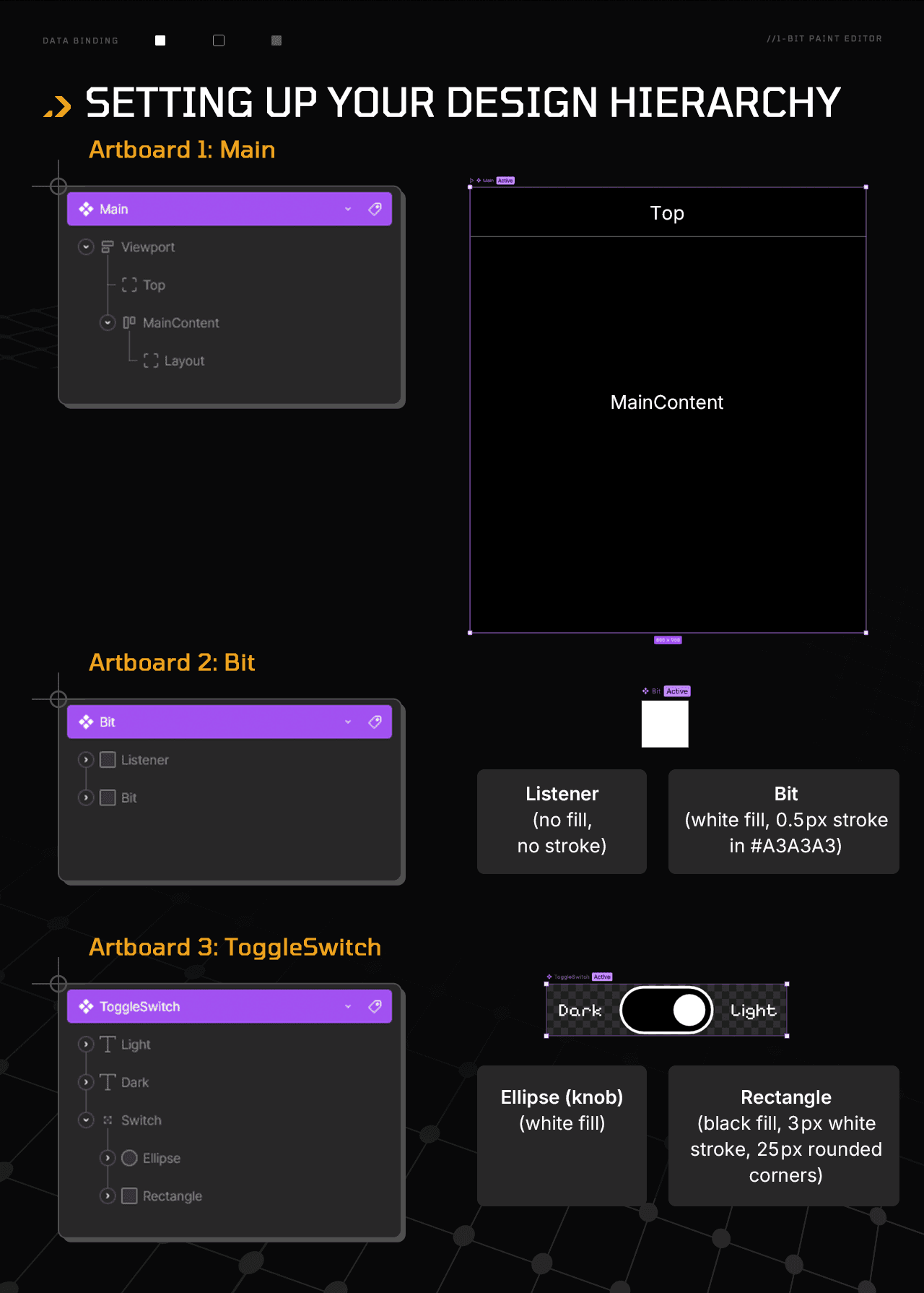 Let’s start by setting up our canvas. We need three artboards: Main, Bit, and ToggleSwitch, configured as follows: