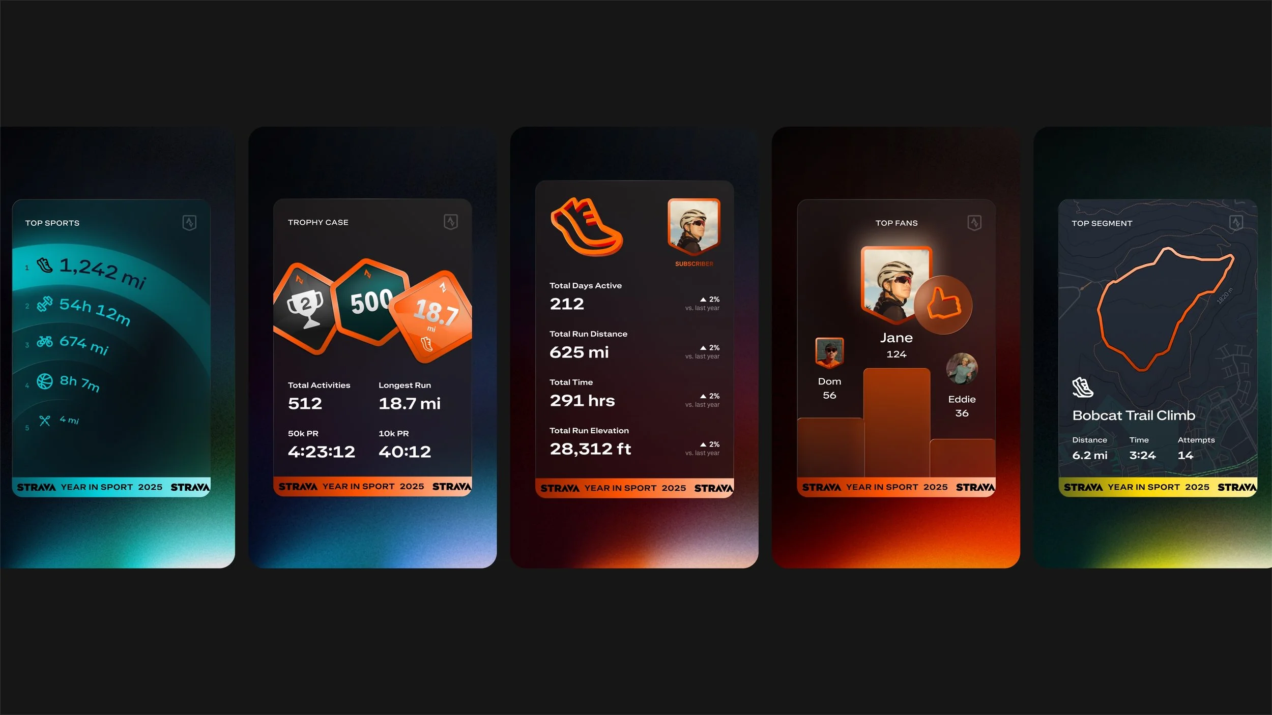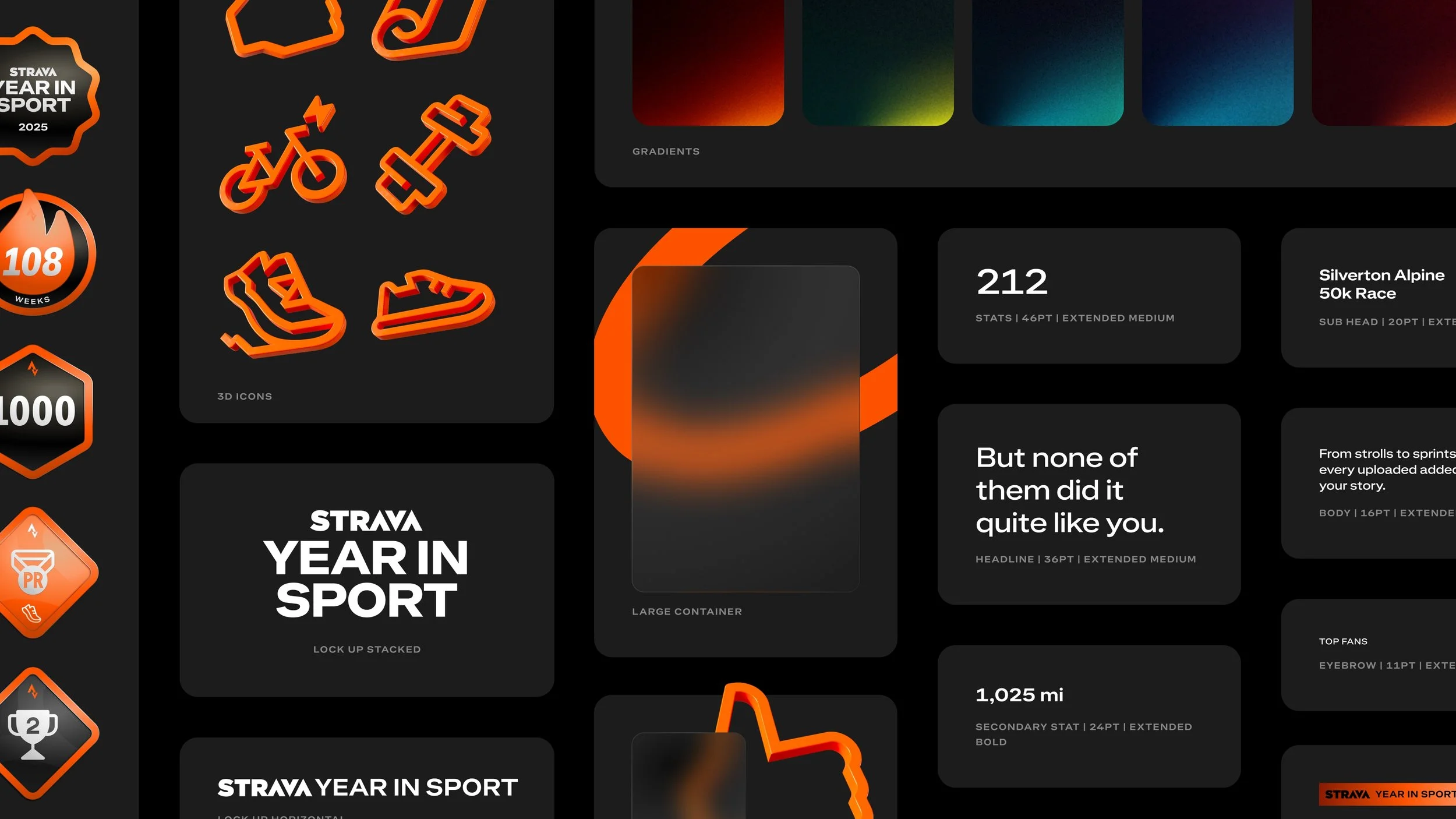 In Riley's words, the design language was "built on the subscription rebrand visual system I developed" and "emphasizes a premium feel for Strava's subscriber-only experience. The system flexes across product and marketing touchpoints, working globally while maintaining brand consistency."